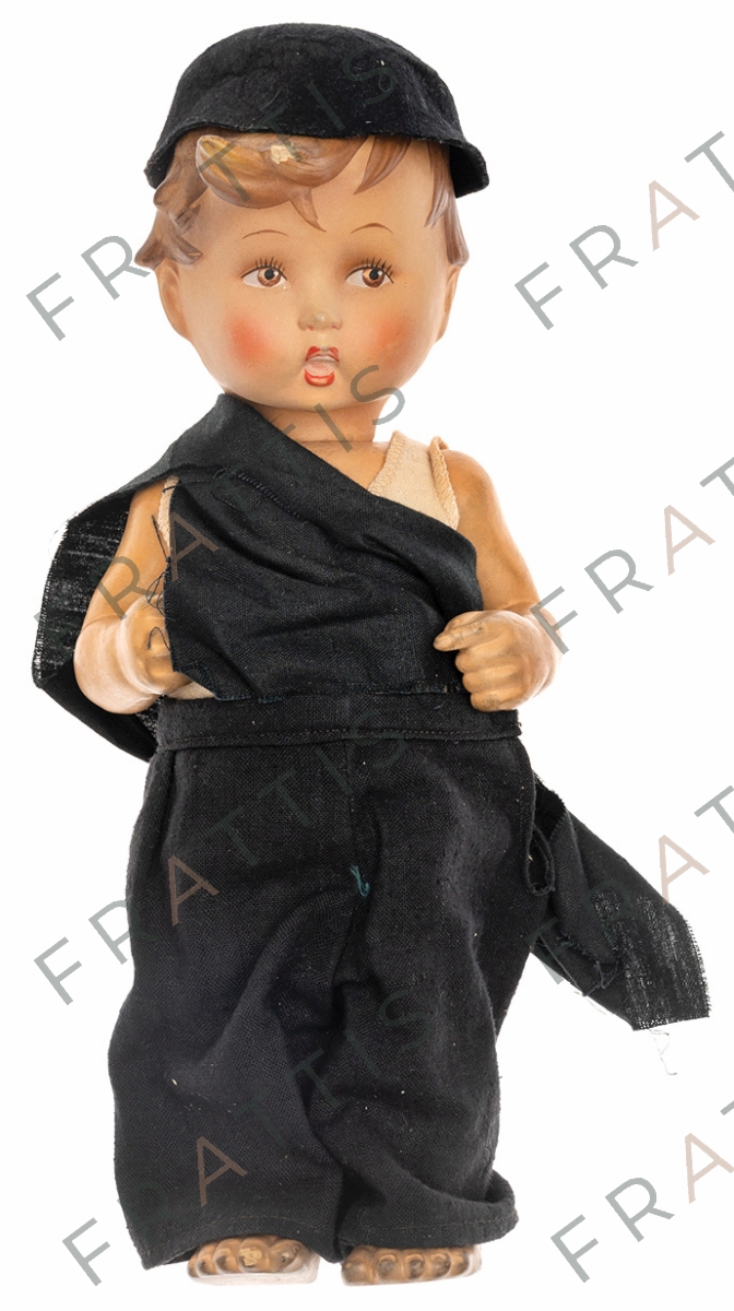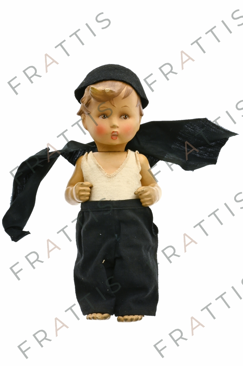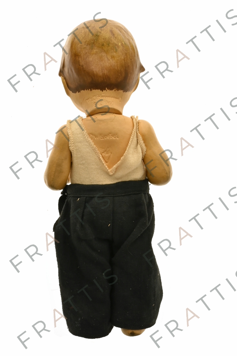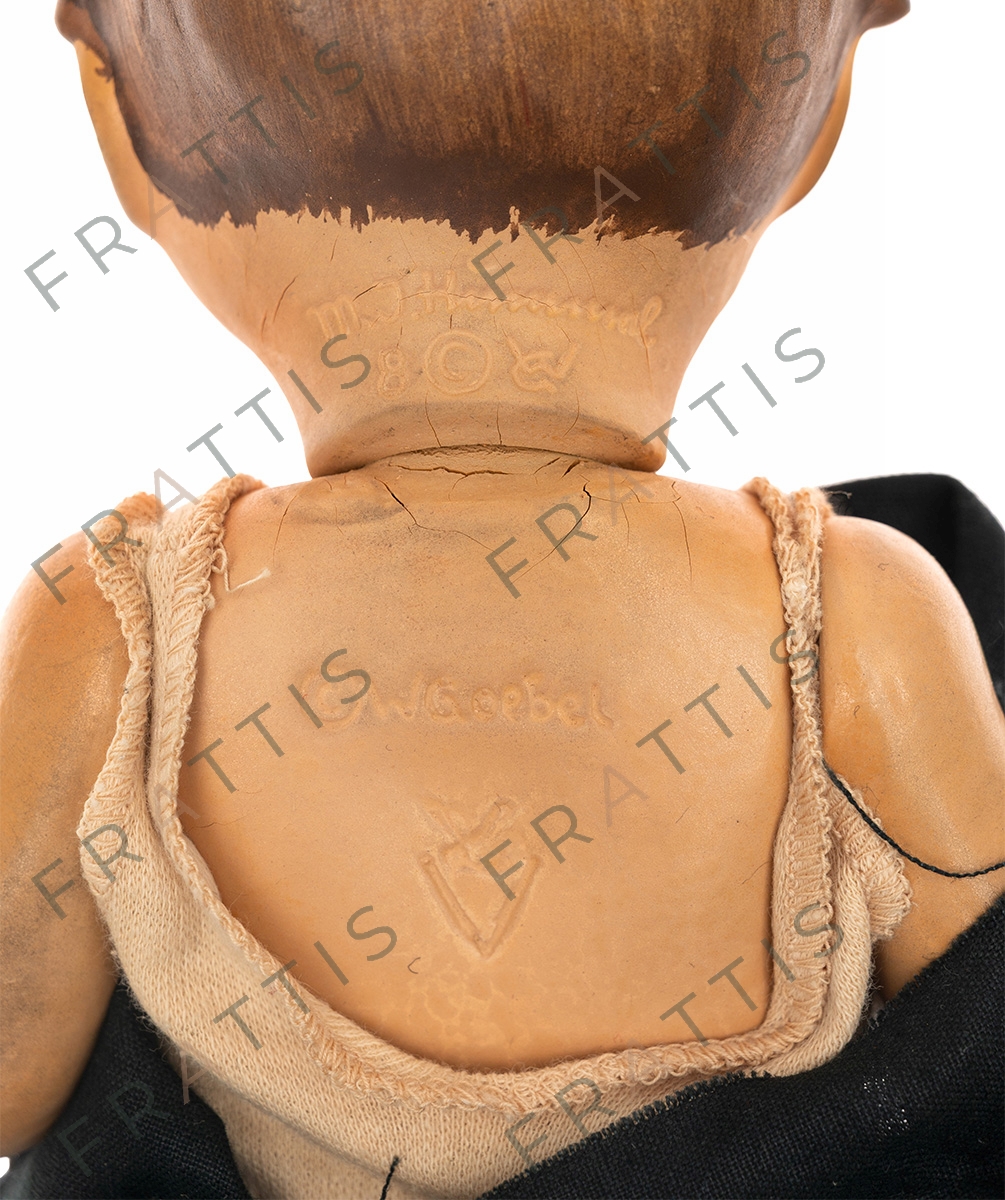 Κούκλα γερμανικής κατασκευής, βασισμένη σε σχέδιο της μοναχής Maria Innocentia Hummel. Σφραγίδα του κατασκευαστή στο πίσω μέρος του λαιμού. Ύψος 28 εκ. Μικρό σπάσιμο στα μαλλιά.